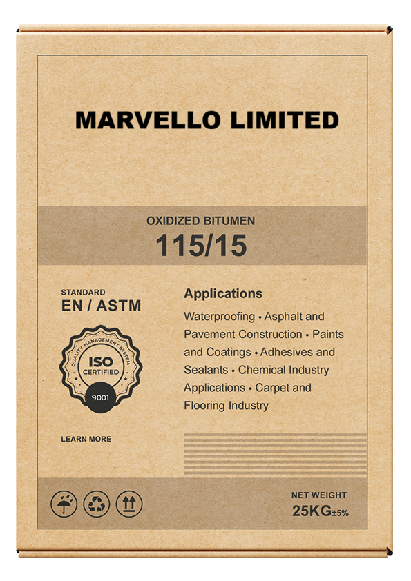 Oxidized Bitumen 115/15 (also known as Blown Bitumen 115/15) is a specialized grade of bitumen created through the oxidation process, where air is blown through bitumen at high temperatures. This results in a material with unique properties, characterized by a high softening point and low penetration value.